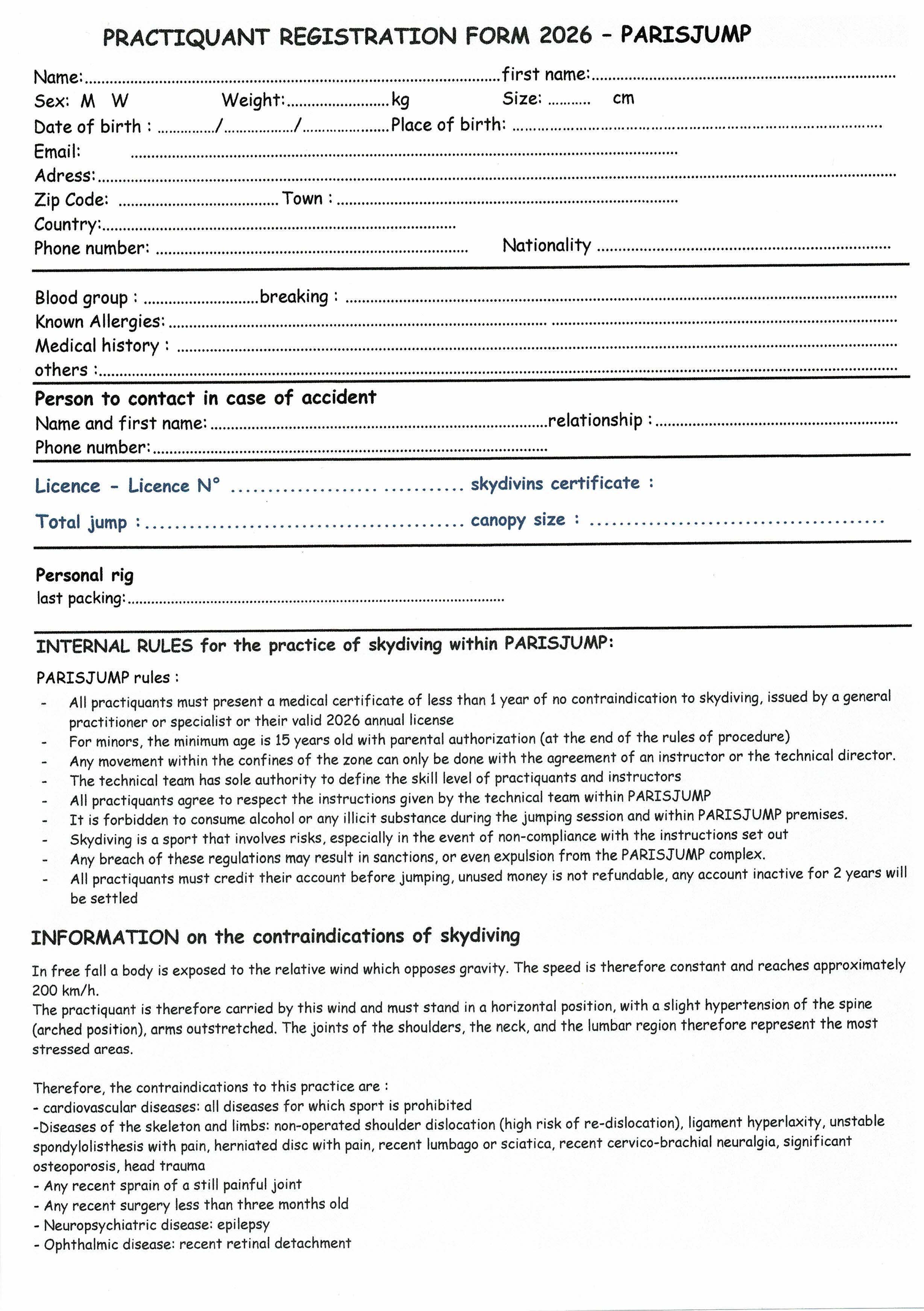 You must fill in the 2 pages of document « pratiquant registration form 2026 » (right click to « save image as » on 2 pictures) and send it back with a copy of your valid foreign license.