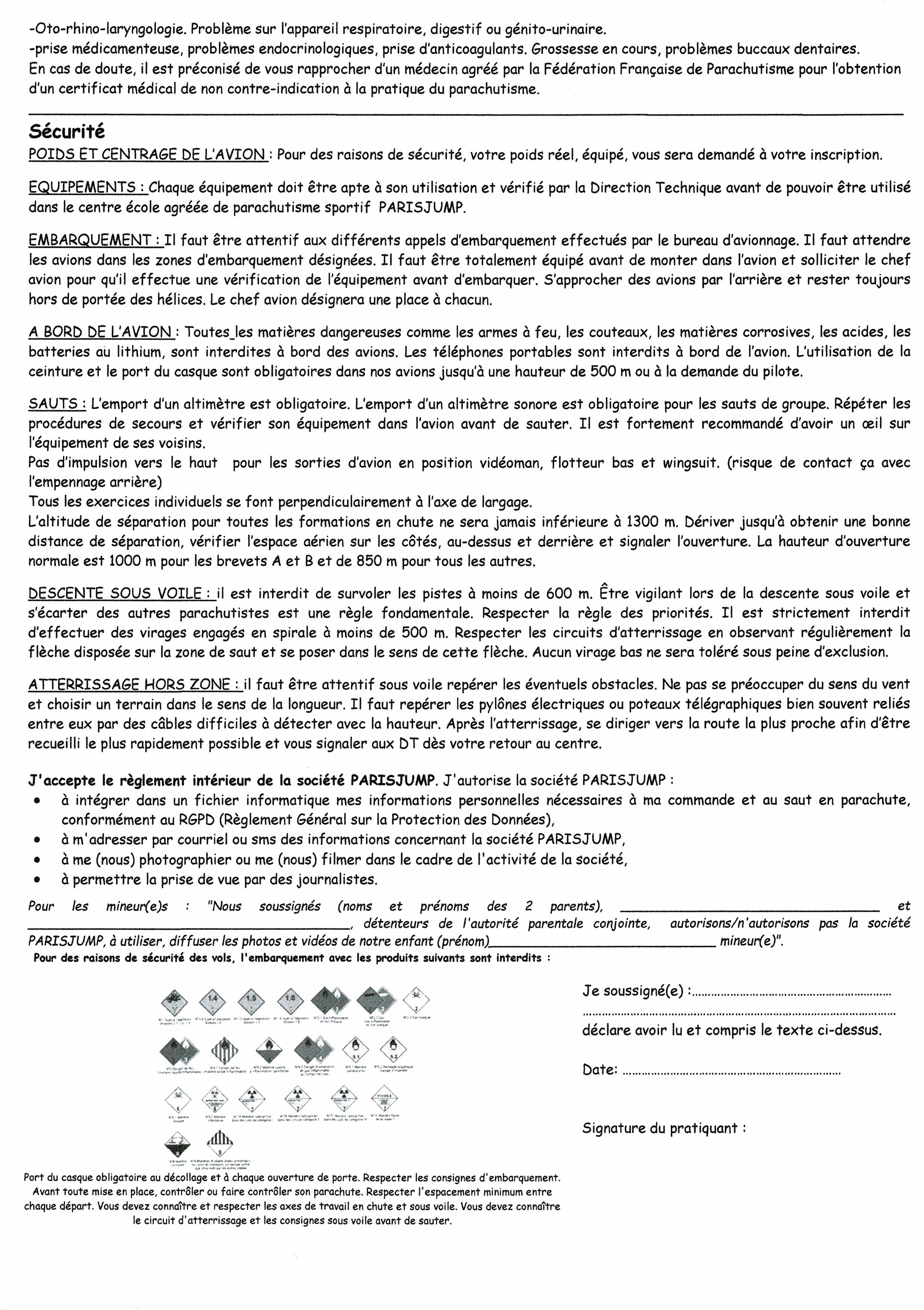 - un certificat médical de non contre-indication au parachutisme de moins d’1 an (fait par un médecin généraliste ou spécialiste).