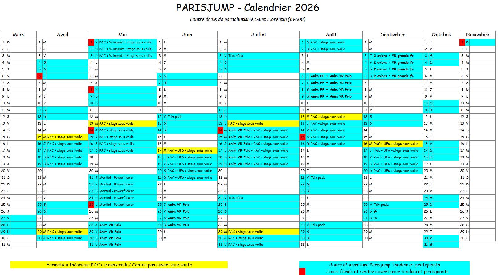Un programme adapté à chaque niveau sera proposé. Les modules théoriques, en chute, sous voile, au sol etc. seront au programme.